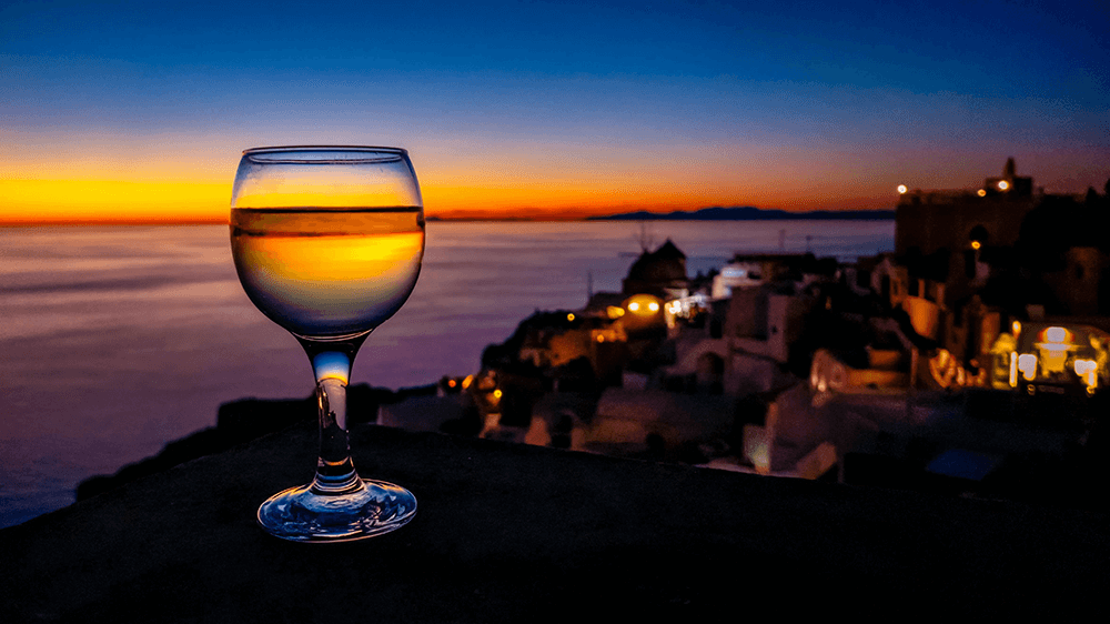 Santorini sunsets are world-famous but enjoying one with a glass of volcanic Assyrtiko makes it even better.